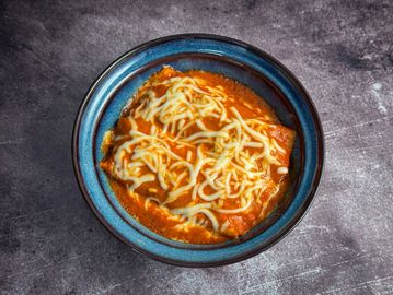 Twin burritos, with bell peppers & ricotta cheese, deep fried and topped with Chicano house blend melted cheese, homemade pico de gallo and served with sour cream.